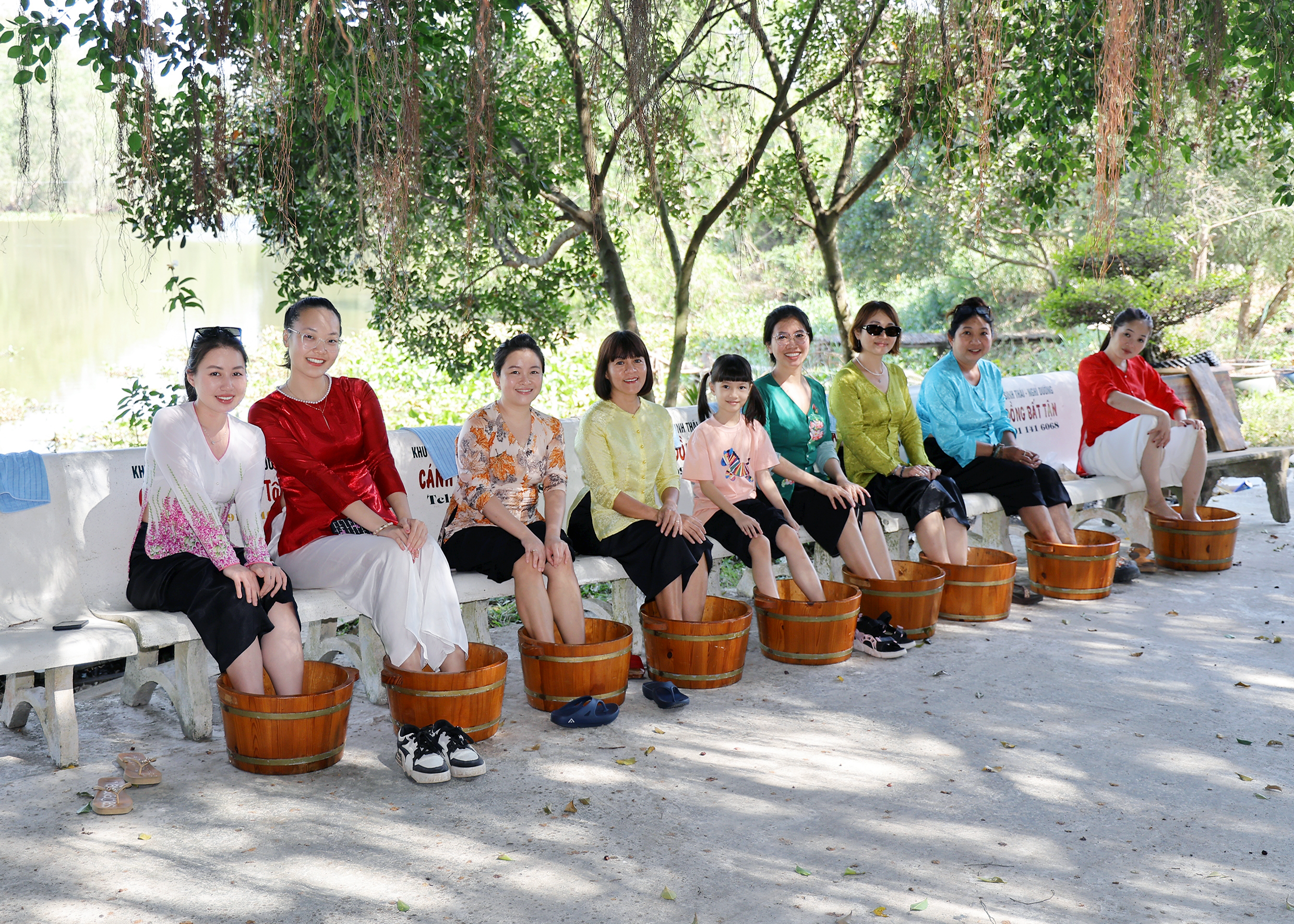 Ngồi dưới bóng cây, ngâm chân trong nước dược liệu ấm, trò chuyện cùng nhau –