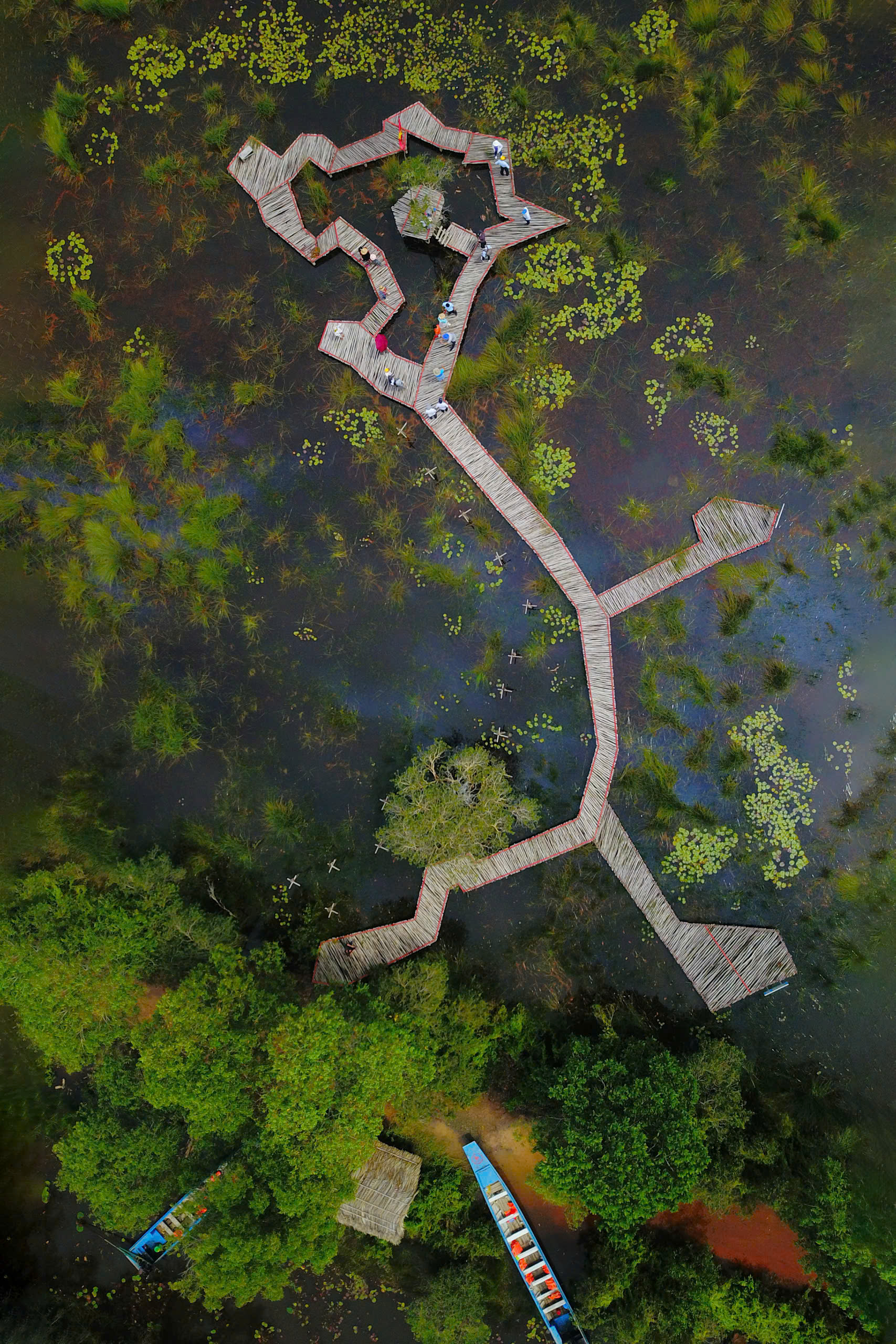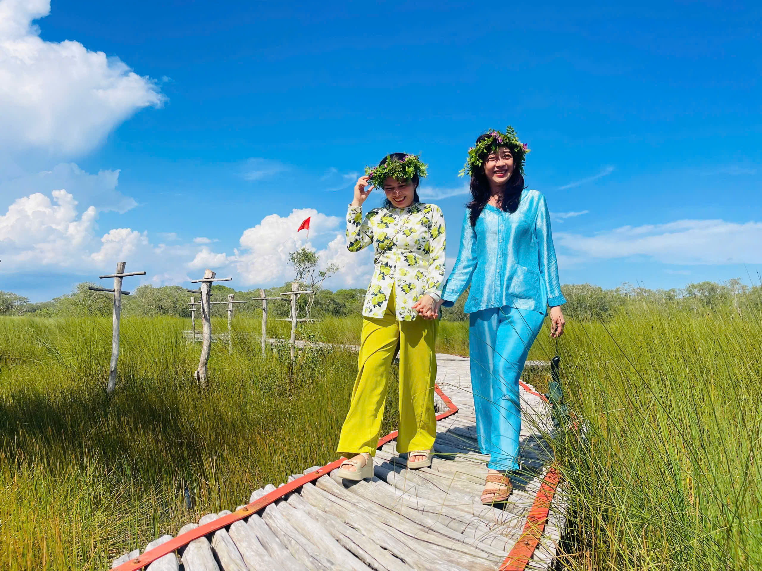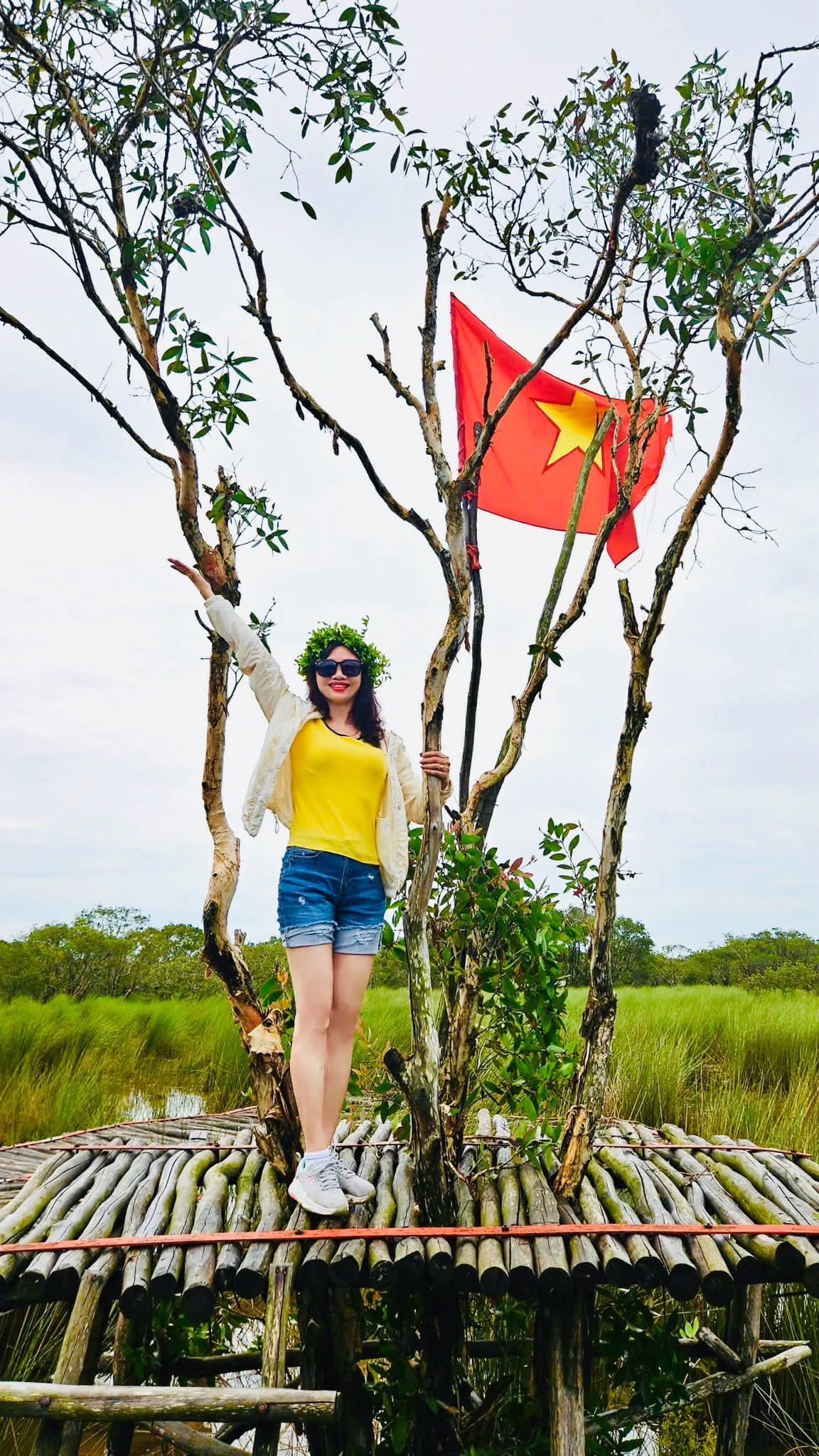 Giữa bạt ngàn cỏ bàng xanh mướt, cây cầu gỗ uốn lượn mô phỏng bản đồ Việt Nam mang đến cho bạn cảm giác như đang đặt chân qua từng vùng miền Tổ quốc. Mỗi điểm dừng trên cầu là một khung hình tuyệt đẹp để lưu lại kỷ niệm.