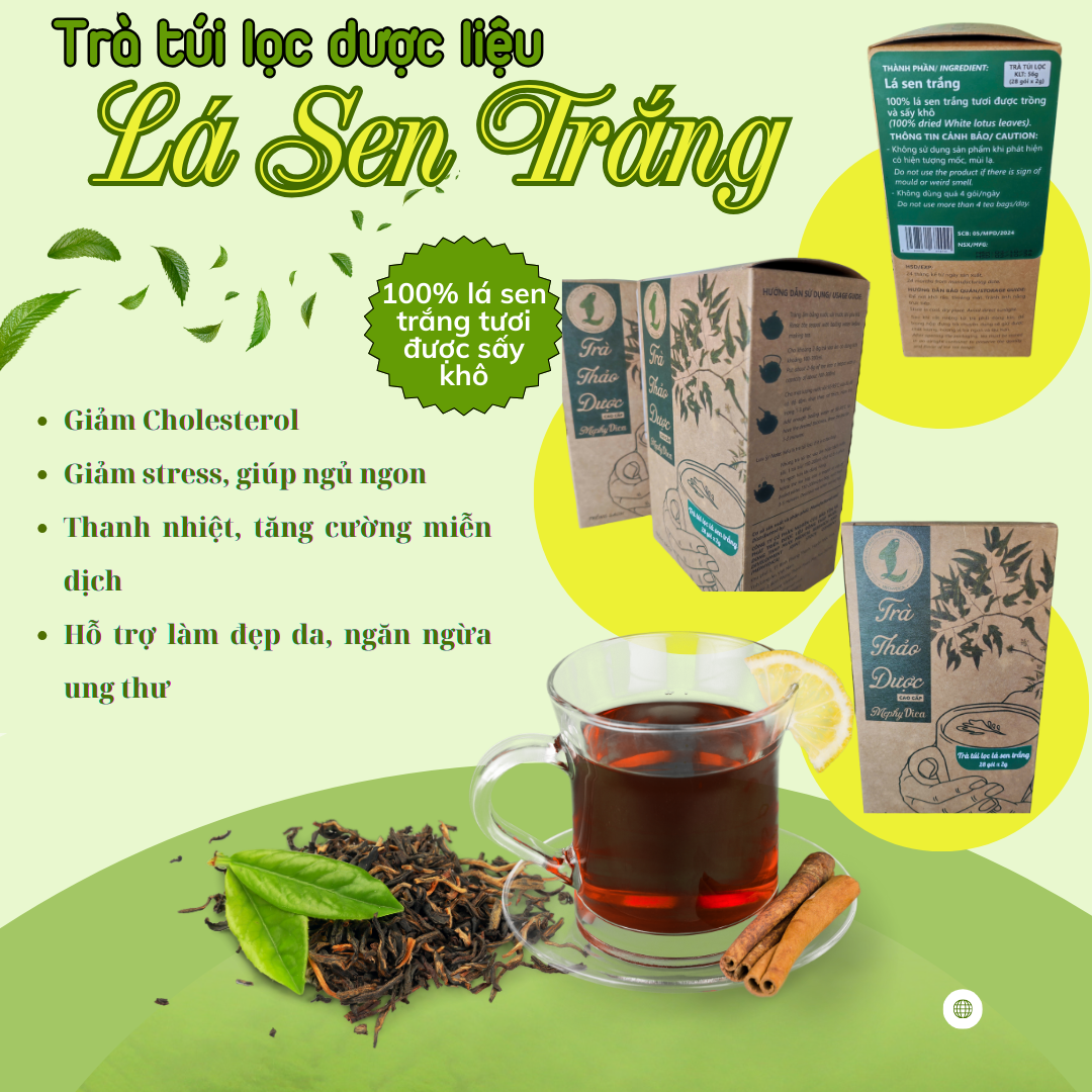 Trà túi lọc lá sen trắng dùng làm nước uống hằng ngày, được phân phối sỉ/lẻ trong nước và xuất khẩu.
